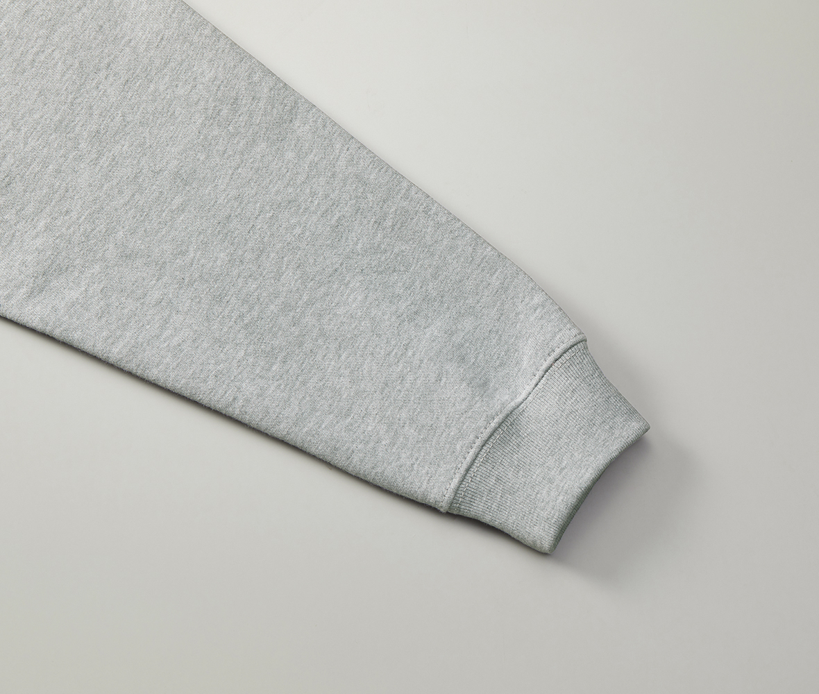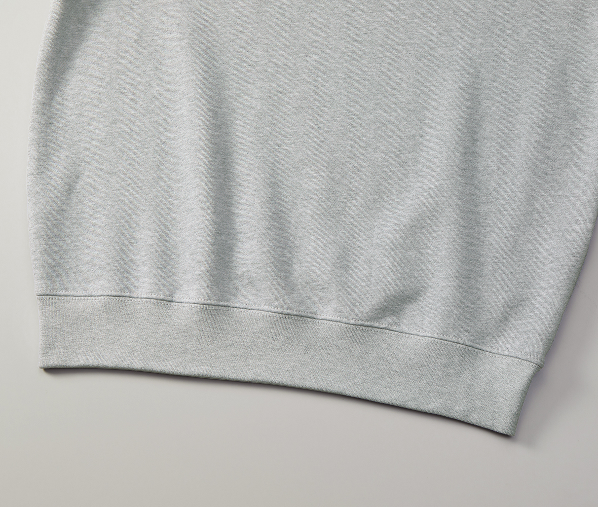 吸水性・伸縮性の優れた裏パイル地に、襟リブ・袖口・裾下にダブルステッチを施した、丈夫さとリラックス感を兼ね備えたスウェット。